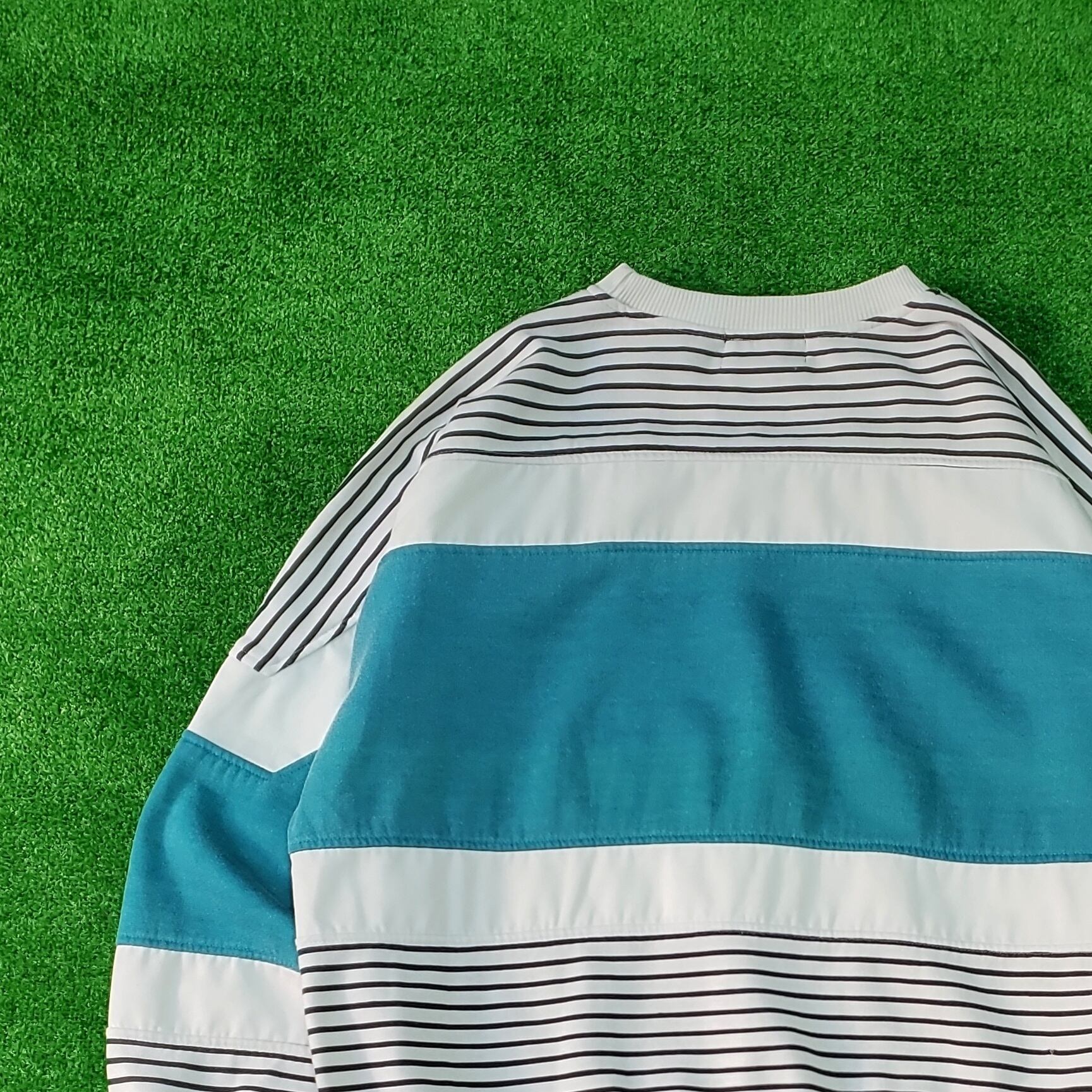 エメラルドグリーンとブラックのボーダー、その間のホワイト地の部分はチノシャツのような生地感。